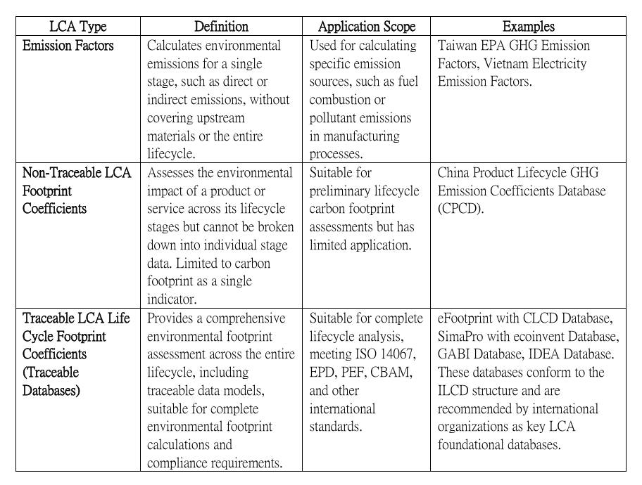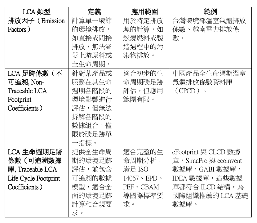 以下是關於LCA資料庫的分類及其特性介紹,以條列式方式呈現,並且說明了排放因子、LCA足跡係數(不可追溯)、以及LCA生命週期足跡係數(可追溯數據庫)之間的差別: