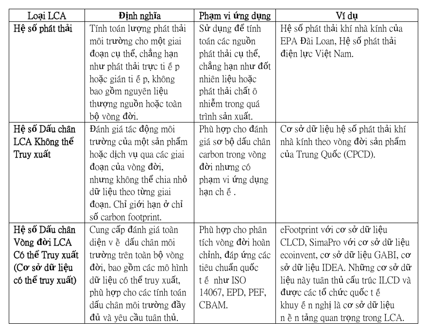 Dưới đây là phần giải thích liên quan đến việc phân loại cơ sở dữ liệu LCA và các đặc điểm của chúng, được trình bày dưới dạng các gạch đầu dòng, với sự phân biệt giữa các Hệ số phát thải, Hệ số Dấu chân LCA (Không thể Truy xuất), và Hệ số Dấu chân Vòng đời LCA (Cơ sở dữ liệu có thể truy xuất):